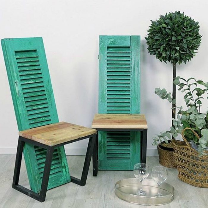 Старые решетчатые ставни можно использовать для создания необычных стульев. Нужно просто прикрепить ставни к старым табуретам и уникальный предмет мебели готов.