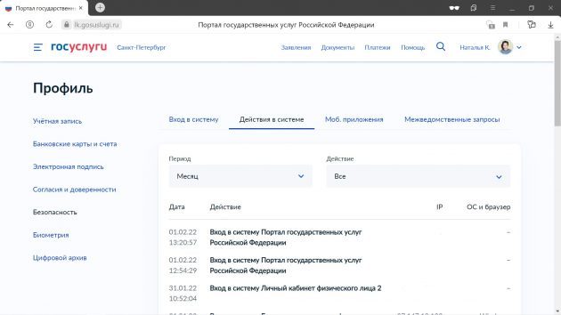 Здесь же в соседней вкладке можно посмотреть все свои (в худшем случае — не только свои) действия в системе.