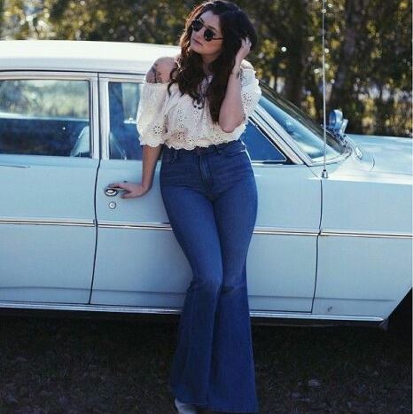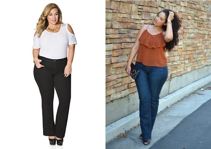 • Следующая универсальная модель, которая станет отличной находкой в гардероб обладательниц plus size – это flared jeans. Такие джинсы визуально удлинят ноги. А ещё их можно использовать в образах в стиле бохо: