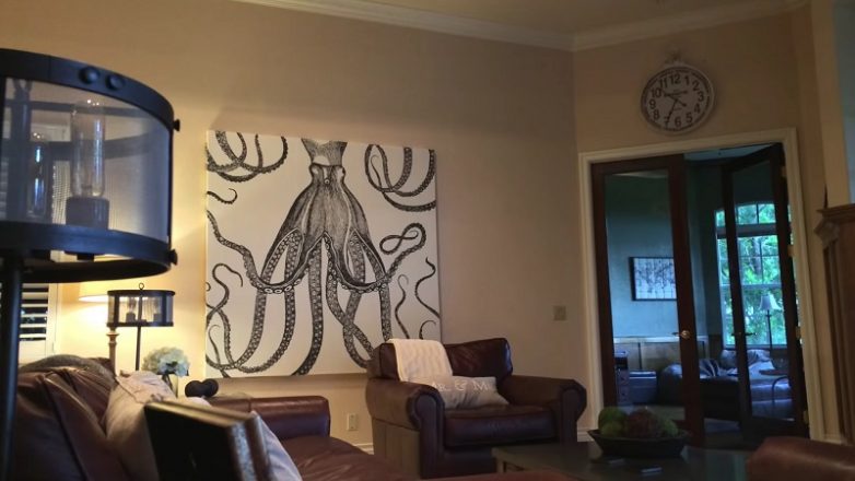 Вот еще одна суперидея, признаюсь честно, мне она приглянулась больше всего! Можно очень легко сделать большую картину, которая облагородит дом. Использовать для этой цели можно обычную занавеску для душа!