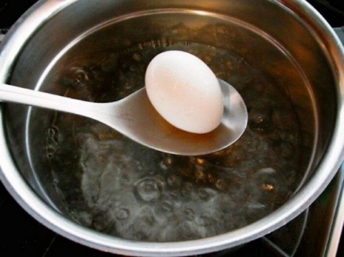 Яйца опускаются в кипящую воду с помощью столовой ложки