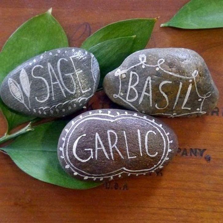 Красиво обозначить, что и где посажено, помогут простые камешки с надписями.