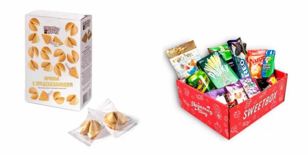 Большая коробка печенья с предсказаниями или упаковка жвачек Love is… с разными вкусами подойдут как нельзя лучше. Кроме того, существуют наборы из пряников, варенья, мёда-суфле или необычных сладостей.