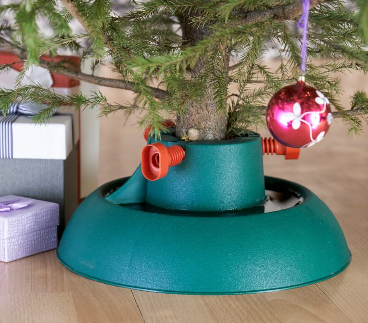 Чтобы елка в подставке стояла идеально ровно, возьмите небольшой кусок фанеры или плитки (что осталось от ремонта) и водрузите подставку на них. Дополнительная поверхность сгладит все неровности пола, в особенности если ель будет стоять на мягком ковре или пол кривоват сам по себе.