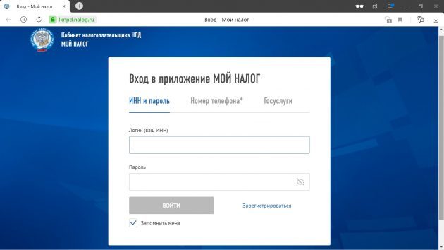 Войти можно с ИНН и паролем от обычного личного кабинета ФНС или с логином и паролем от «Госуслуг».