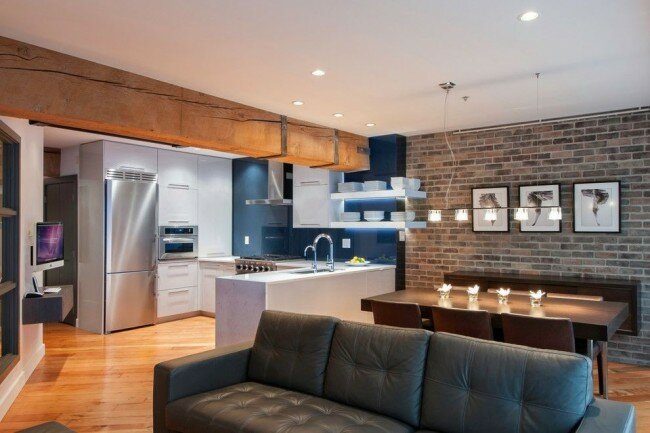 Другой стильный дизайн интерьера выполнен в более тёмных тонах. Чёрный цвет красиво сочетается с деревянными элементами и имитацией кирпичной кладки на одной из стен, а светлый кухонный гарнитур и светлый фон декоративных картин создают акценты. В сравнительно небольшом пространстве также уместилась и обеденная зона, и место для отдыха за счёт совмещения с кухней.