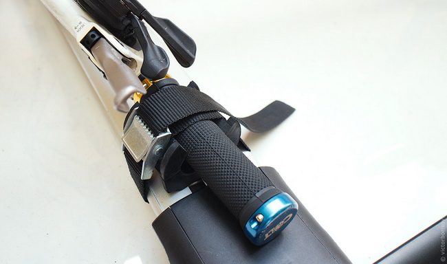 10. Теперь берем наши крепежные ремни и фиксируем руль, обмотав ремень вокруг поперечины. Для удобства использования я обрезал два ремня до длины 40 см вместо штатных 2,5 метров. Напомню, что подобные крепежные ремни рассчитаны на нагрузку в 75 килограмм, а у нас их целых 3 штуки и они держат велосипед со средним весом 15 килограмм. Надежность же всего крепления определяется теперь лишь прочностью фиксации самих поперечин к рейлингам, в отличие от серийных велосипедных багажников, где велосипед устанавливается вертикально и от падения вбок его держит только одна палка, закрепленная за нижнюю трубу рамы.
