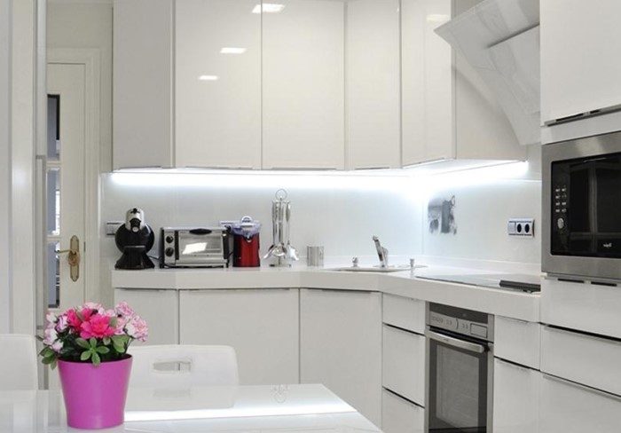 Ну кухне нужно сделать несколько световых зон: одну над рабочим местом, а вторую над обеденной зоной. Без этого пространство попросту не будет функциональным. Во время готовки придется излишне напрягаться, да и ужин при тусклом освещении не вызывает радости.