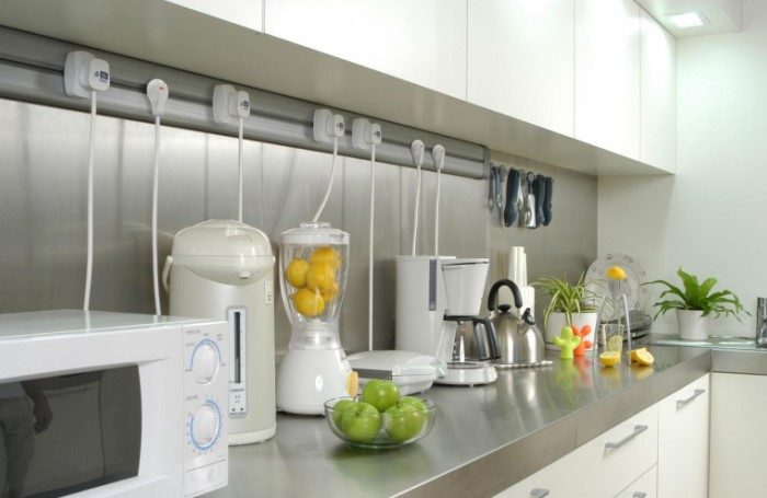 Провода от бытовой техники хочется скрыть, однако ничего не выйдет, если вы расположили розетки в заведомо неудобных местах. Тогда черно-белые кабели «расползутся» по столешнице, чем испортят интерьер. В случае розеток актуально правило: лучше больше, чем меньше. Невозможно заранее предугадать, сколько электроприборов понадобится на кухне и не будете ли вы в будущем покупать новые устройства. Поэтому предусмотрите этот момент, чтобы не загромождать рабочую зону мелкой бытовой техникой и проводами. Так будет намного удобнее и дешевле, чем переносить розетки на готовой кухне.