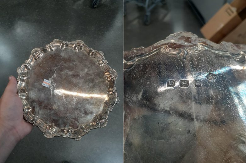 3. Поднос из стерлингового серебра на 19,51 унции, купленный за 3,25 доллара. Присутствует британское клеймо, поставленное в Лондоне в 1763 году мастерами Томасом Ханнэмом и Ричардом Миллсом.