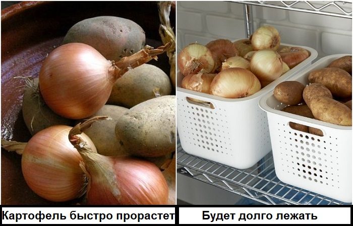• Следует учитывать «товарное соседство». Некоторые продукты просто нельзя хранить в непосредственной близости друг от друга. Например, если складывать лук и картофель в один ящик, второй слишком быстро начинает прорастать. Это связано с тем, что лук выделяет много тепла и влаги, даже если хранится в темном месте. В результате картофель оказывается в своеобразной теплице и быстрее созревает.
