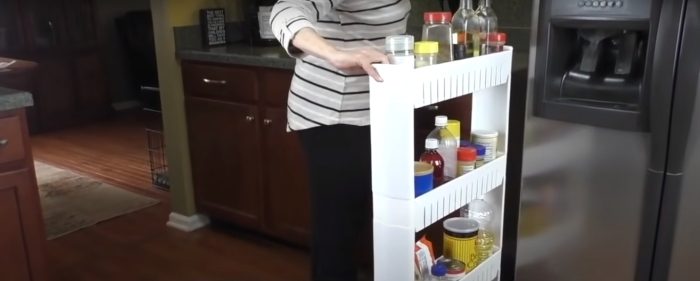 Обычно на кухне между холодильником и шкафами кухонной стенки остается незаполненное пространство. Оно необходимо, чтобы обеспечить свободный доступ воздуха к стенке холодильника, ведь так она не будет перегреваться. Однако и это полезное пространство можно использовать с пользой и безопасно. Например, поставив туда такой удобный пластиковый стеллаж с четырьмя полочками. На них можно поставить все бутылочки с маслом и соусами, приправы, консервацию, вино или другие напитки. Также там можно хранить моющие средства, конечно, не вместе с продуктами. При этом открытый вид стеллажа сохраняет доступ воздуха к стенке холодильника и не нарушает его работу. Все полочки и детали стеллажа свободно собираются и разбираются.