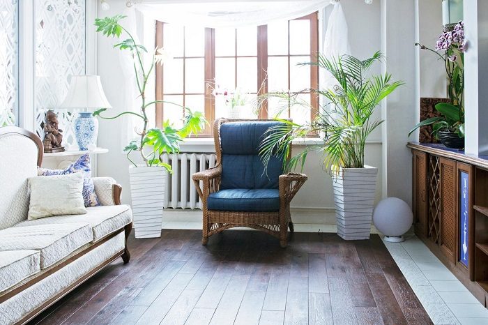 Правила выбора цветка и горшка предельно просты: чем больше помещение, тем крупнее должно быть растение. Например, в просторной гостиной, рядом с диваном прекрасно будет смотреться монстера, фикус, пальма. Но в этом случае сначала нужно будет определить место для кашпо, а потом уже выбирать растение, исходя из имеющихся условий, в частности, качества освещения и температуры. Купите несколько красивых плетеных корзинок вместо классических горшков – они идеально подходят для напольных экземпляров.