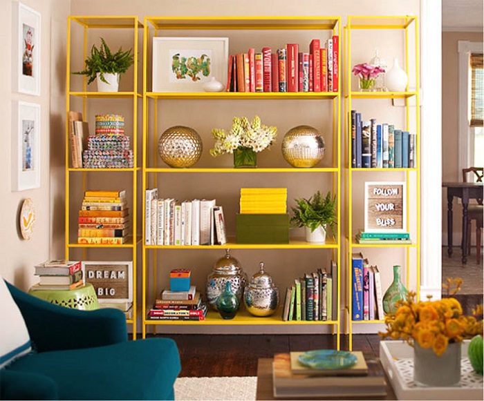 Первое, о чем следует подумать – это книги. Несмотря на то, что они не являются декором в классическом понимании этого слова, многие привыкли расставлять их таким образом, чтобы они украшали комнату. Загляните на стеллаж, переберите имеющиеся книги, а затем сгруппируйте их по размеру: самые крупные произведения стоит положить горизонтально, а с помощью изданий среднего размера обозначить вертикаль. Интересным трендом является разворот книг страницами вперед. Главный плюс этой тенденции состоит в том, что за счет однообразного цвета и фактуры страниц можно уравновесить интерьер.