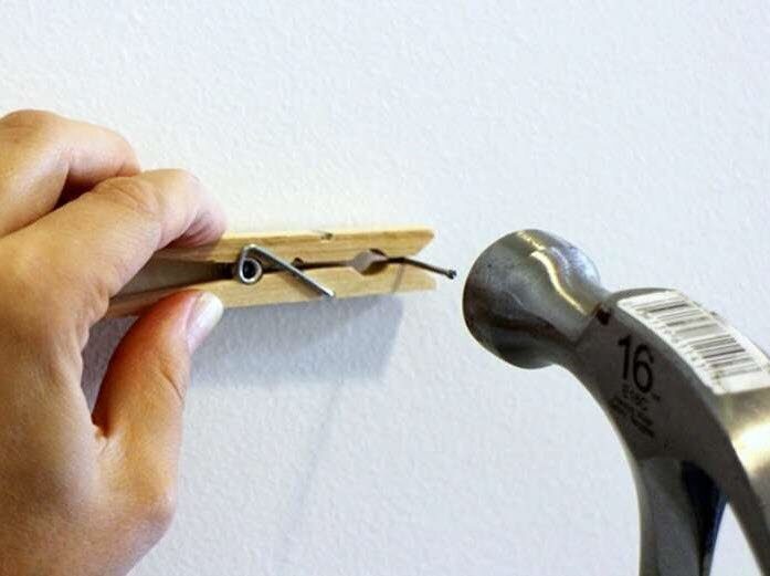 Если боитесь попасть по пальцу во время работы с молотком, то можно воспользоваться прищепкой, чтобы поддерживать гвоздь.