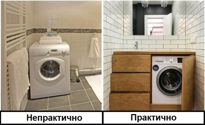 По поводу приёма 6. И что практичного в том, что стиральную машину встроили куда-то? Это далеко не практично. Ведь если с ней поломка какая-то произойдёт или протечка, как её будут доставать? Думать же надо.