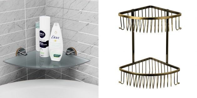 Для хранения шампуней, кондиционеров и гелей подойдёт полка, установленная на стене возле душевой или ванны. Если выбрать модель с крючками, получится развесить щётки, мочалки и другие банные принадлежности. Обычно такие полки изготавливаются из материалов, которые на боятся влаги и долго не теряют привлекательный внешний вид.