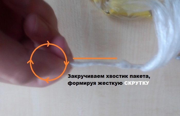 Развязать даже самый плотный узелок можно при помощи старой советской хитрости, которая позволяла развязывать и сберегать первые целлофановые пакеты. Итак, сначала нужно взяться одной рукой за узел, а второй ухватиться или за кончик узелка сверху или за нижнюю часть пакета. В зависимости оттого, с какой стороны был осуществлен хват, начинаем накручивать пакет или сверху, или снизу. Сворачиваем целлофан в жёсткую, твердую трубочку. При этом следует придерживать узел так, чтобы он не слишком сильно зажимался.