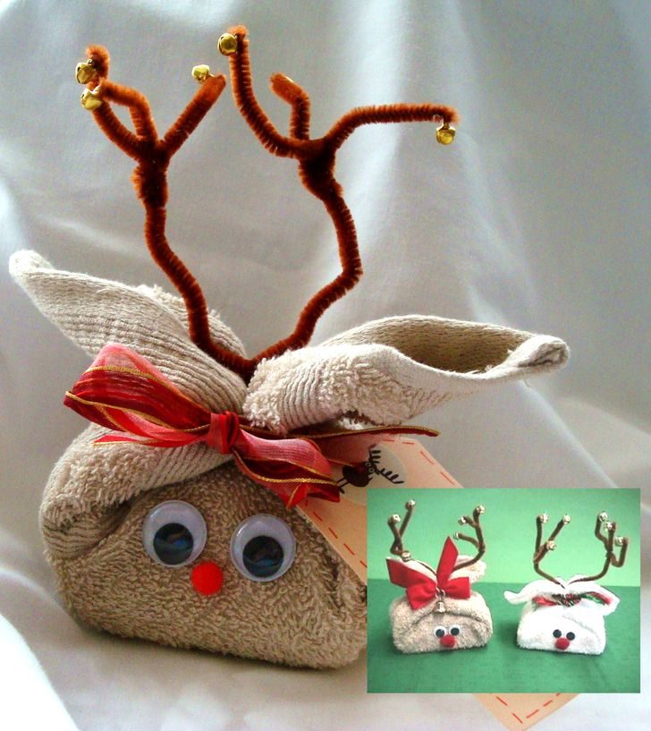 Перевязав края полотенца лентой, вы сможете сделать забавного оленя. Отличная идея, чтобы спрятать какое-нибудь маленькое сокровище для ребенка.