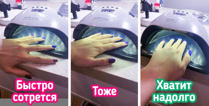 Положение руки в лампе во время маникюра также играет важную роль. Рука в лампе должна лежать параллельно столу. Не напрягайте руку и не прижимайте пальцы слишком сильно друг к другу, тогда лак просушится равномерно. Из-за неправильного положения рук в лампе покрытие может не просушиться полностью, что значительно уменьшит срок его носки.