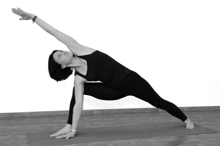 Очень эффективное упражнение из йоги как для ног, так и для боков. Порядок выполнения для правой ноги. Делается максимально широкий выпад правой ногой. Затем отстраивается левая стопа: её внешний край должен быть прижат к полу. Затем правая ладонь ставится вплотную перед правой стопой. Плечо и область подмышки оказываются плотно прижатыми к правому колену. Левую руку нужно поднять вверх. Смотреть нужно на поднятую руку или впереди себя. Затем повторить упражнение для левой ноги.