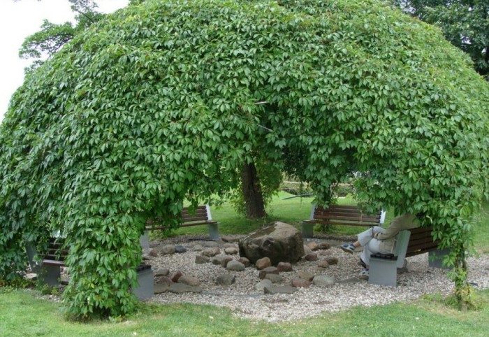 Неприхотливая и выносливая культура с длинными лианами популярна среди дачников, поскольку она быстро разрастается и за ней легко ухаживать. Подготовьте металлическое основание и высадите виноград. Культуру достаточно подрезать раз в год. На зиму растение не нужно укрывать, поскольку оно стойко переносит заморозки. В течение 2-3 лет виноградные лозы оплетут беседку плотным ковром, создавая благодатную тень.