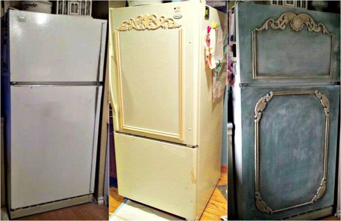 С помощью краски пастельного цвета и нескольких декоративных молдингов можно превратить старый холодильник в настоящий арт-объект. Плюсом этого проекта является то, что неаккуратная покраска не только не испортит внешний вид, а только добавит шарма общему оформлению.