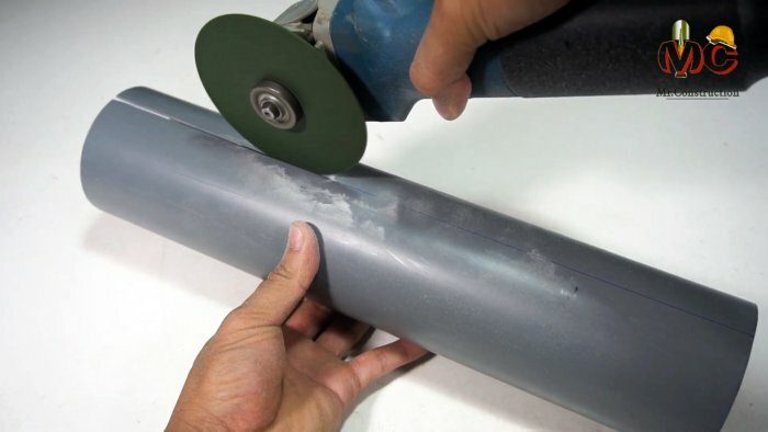 Обработке пластик поддаётся хорошо, никаких проблем с изготовлением лопастей нет. Только не стоит держать трубу в руках при работе отрезным кругом. Лучше зафиксировать её на верстаке или другой подходящей поверхности.