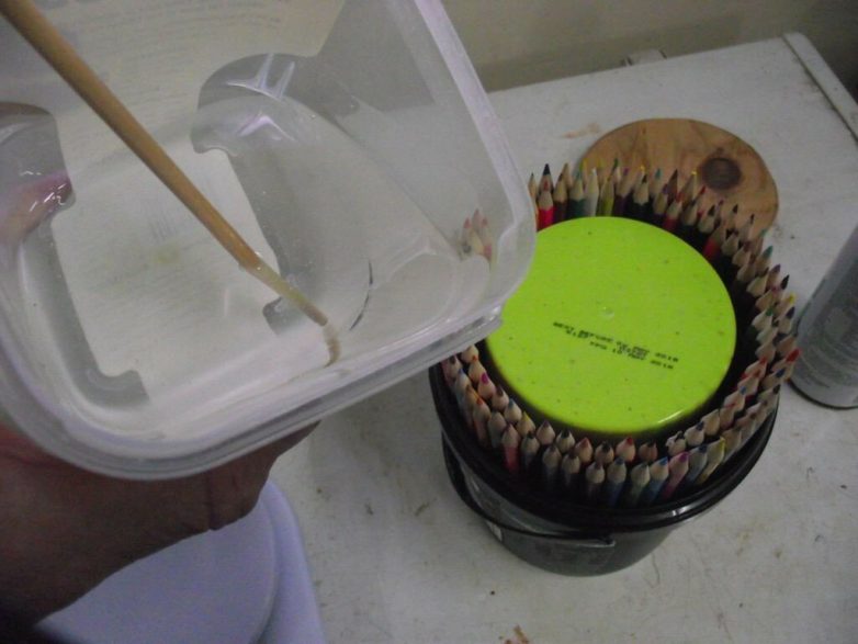 Заливаем карандаши эпоксидной смолой до края ведерка.