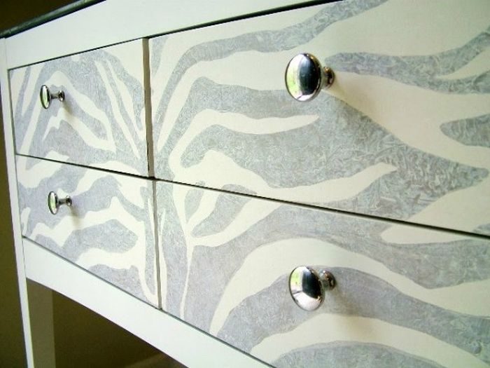Покраска комода, превратится в интересный творческий процесс, если дополнительно использовать трафареты. Кстати, их не сложно сделать собственными руками! А мотив может быть любой – от абстракции до геометрических фигур.