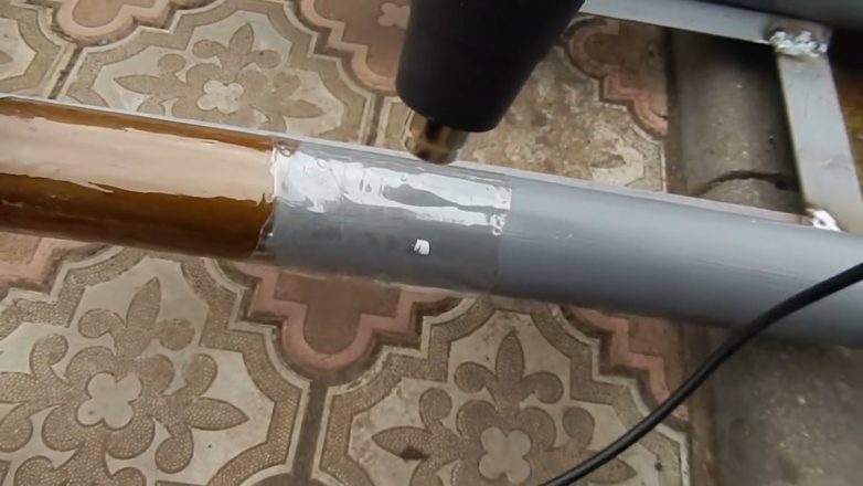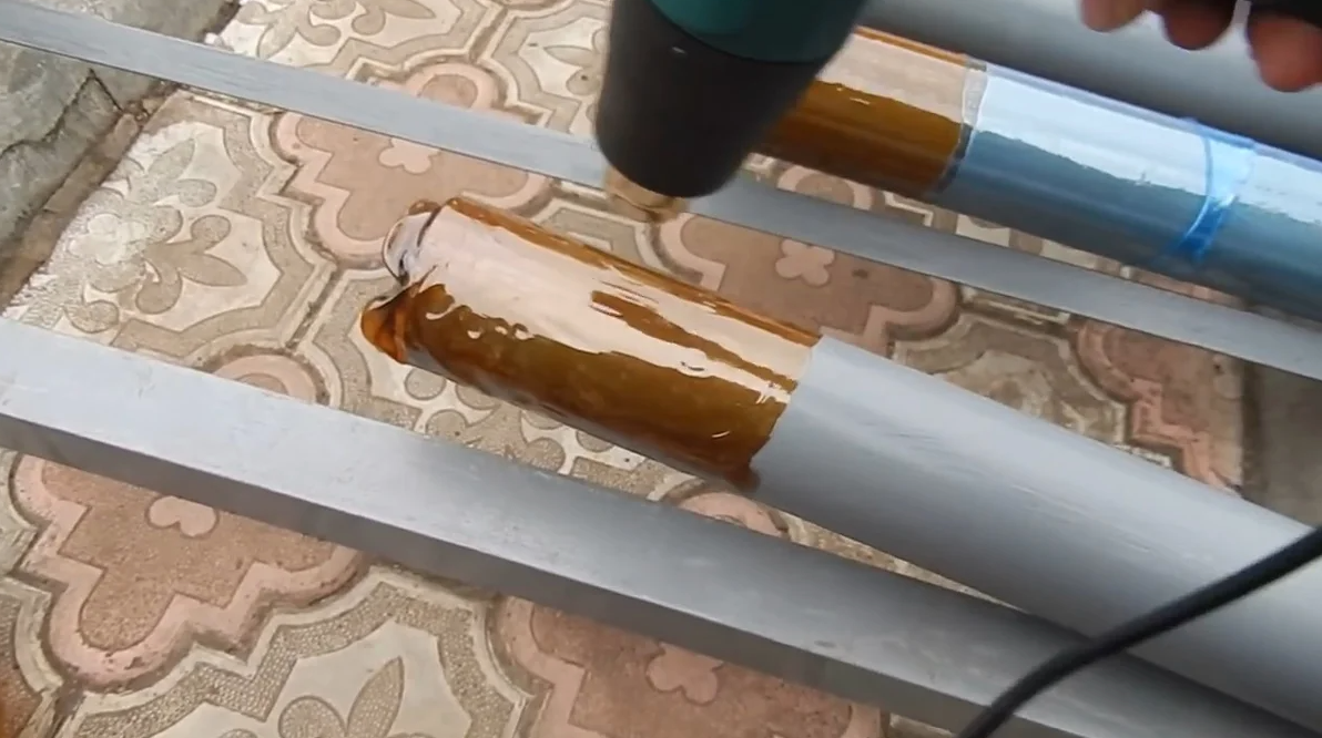 С помощью строительного фена начинаем аккуратно и равномерно прогревать пластик. От температуры пластиковая бутылка значительно уменьшается в размерах и плотно прижимается к металлическому столбу.