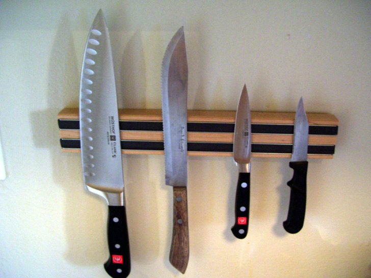 Магнитные держатели для ножей и других кухонных принадлежностей — отличная альтернатива обычным держателям, которые стоят на столешнице. Во-первых, магнитная лента более гигиенична, а также экономит место на кухне. Крепить к ней можно не только ножи, но и специальную магнитную посуду. А деревянные подставки, к слову, необходимо менять раз в год.