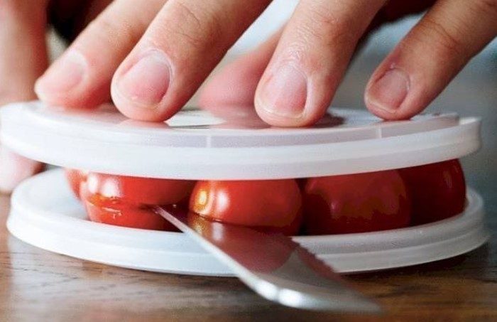 Мини-помидорки неудобны тем, что с ними приходится долго возиться. Однако есть способ, как буквально одним движением нарезать сразу все черри. Положите помидоры на плоскую тарелку и сверху слегка придавите еще одной. Большим ножом проведите по центру черри и одним движением получится разделить сразу несколько штук пополам и не пораниться.