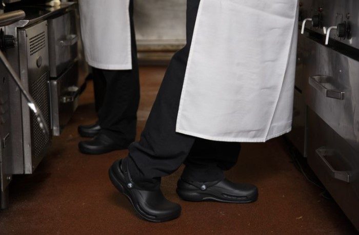 Замечали, что повара обычно ходят в закрытой обуви? Это неспроста, ведь в процессе работы из рук может выскочить нож или капнуть горячий соус, поэтому ноги должны быть защищены. К тому же, клоги поддерживают подъем стопы и оказывают ортопедический эффект, что актуально для людей, которые целый день на ногах. Дома их тоже можно носить или подобрать ортопедические шлепки.