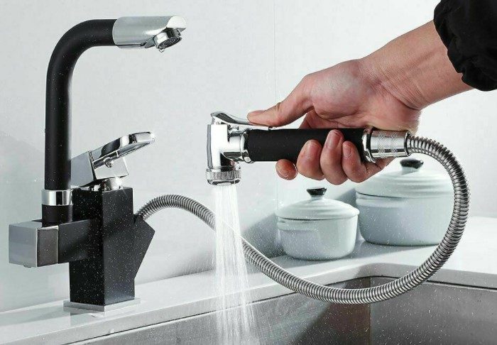 В ресторанах устанавливают специальные смесители с длинным подвижным шлангом. Прибор позволяет легко вымыть раковину, посуду и любой уголок на столешнице. С его помощью получится быстрее наполнить водой большие емкости.