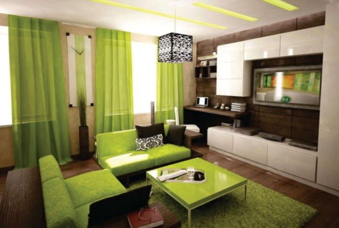 Если в гостиной стоит зеленый диван, это вовсе не значит, что цвет должен использоваться во всем интерьере. Не бойтесь экспериментировать и задействовать другие тона. Например, оттенки зеленого или контрастные цвета. Но не старайтесь подобрать все тон в тон, иначе интерьер быстро надоест.