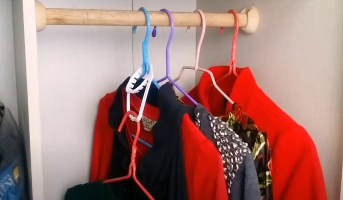 В какой-то момент в шкафу может перестать хватать места на вешалке. Расширить потенциал гардероба можно за счет повешения одной вешалки на другую. Делать это можно и без специальных приспособлений. Но куда лучше сцеплять две вешалки через пластиковое кольцо ручки 5-литровой бутылки.