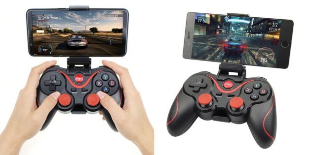 С помощью Bluetooth‑контроллера получится сделать из смартфона приставку для игр, например гонок или шутеров. Корпус гаджета эргономичен, механические кнопки быстро отзываются на нажатия. Комплектуется устройство специальным держателем для смартфона.