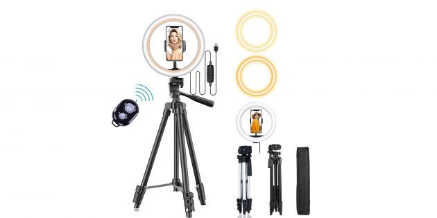 У лампы диаметром 26 см три световых режима: холодный, тёплый и нейтральный. Крепится она на штатив, который имеет телескопическую конструкцию и раскладывается от 29 до 50 или от 34 до 102 см вверх.