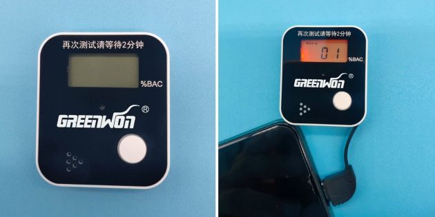 На корпусе устройства находятся единственная кнопка управления и крупный дисплей, на котором отображаются цифры. В описании товара продавец перечисляет массу факторов, способных повлиять на достоверность результата, просит не относиться к полученным данным слишком серьёзно и не садиться за руль в нетрезвом виде.