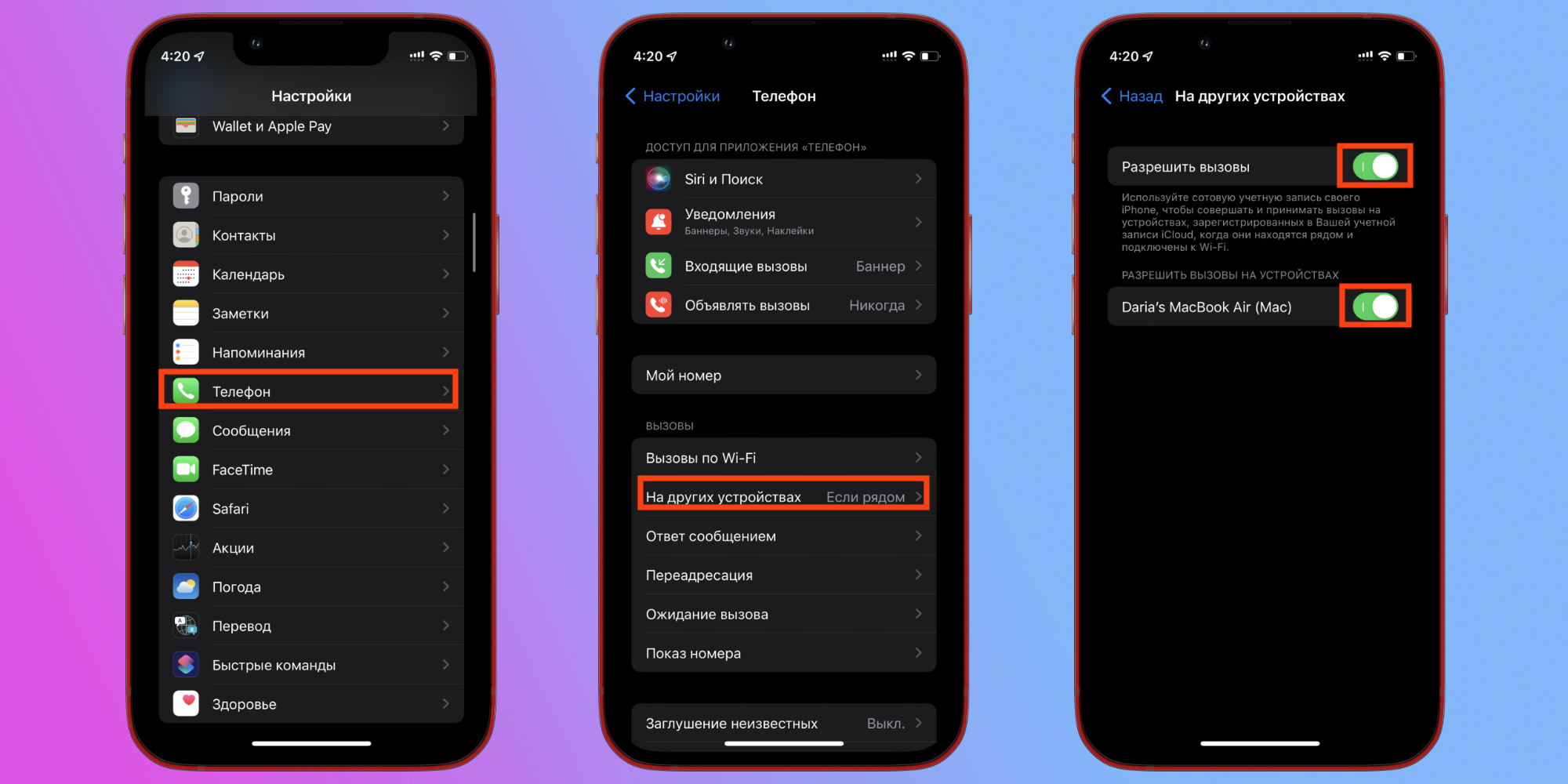 Убрать возможность звонить и принимать звонки на Mac или iPad можно за пару секунд на самом iPhone. Для этого: