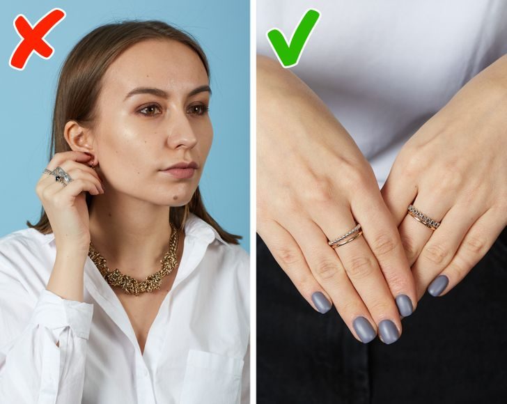 Не стоит надевать на себя все украшения сразу — даже если они вам уж очень нравятся. Особенно это касается крупных, броских аксессуаров: массивных ожерелий, крупных серег и колец с крупными камнями. Лучше выбрать что-то одно — так ваш образ получится намного элегантнее.