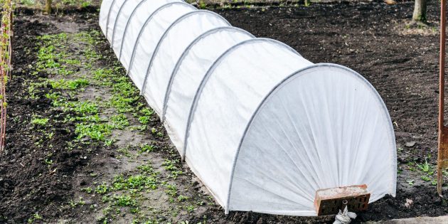 Наиболее простой вариант конструкции, который идеален для небольшого парника. Прямо на грядку устанавливается каркас из арматуры, а поверх него натягивается агроволокно или, как его ещё называют, спанбонд. Такой материал защищает от солнца, при этом сохраняя тепло и влагу.