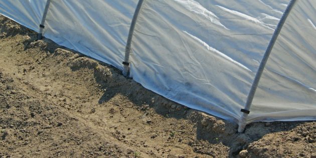 4. Спанбонд можно прострочить на швейной машинке, сформировав складки-кармашки, которые надеваются прямо на дуги. Другой вариант — установить по бокам грядки направляющие из пластиковой трубы и крепить агроволокно к ним с помощью покупных клипс или разрезанных кусочков труб. Укрывной материал в итоге легко можно будет поднять, просто сняв их.