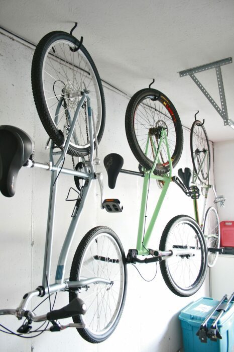 В гараже помимо прочего часто хранятся велосипеды. Все бы ничего, но они занимают достаточно много места. Чтобы решить проблему, достаточно просто закрепить на потолке два надежных крючка, а потом подвешивать велосипеды на них. В гараже с высокими потолками это значительно облегчит проходимость.
