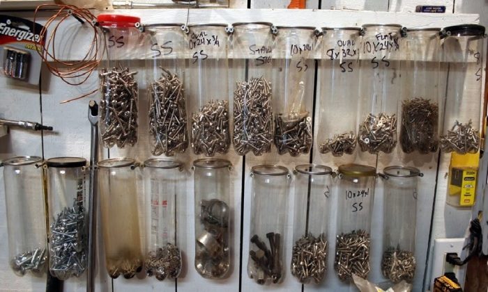 С таким подходом в организации хранения все мелкие детали для ремонта будут всегда на своем месте и не потеряются. Несколько пластиковых бутылок с обрезанным верхом или отверстием в верхней части станут отличным вместилищем для гвоздей, саморезов, болтов, гаек, крючков, сверл, хомутов и других деталей. Закрепить бутылки лучше всего на стене с помощью саморезов или гвоздей, либо же повесив на крючок.
