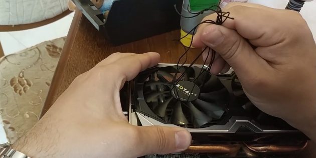 Ещё вариант, который чаще всего применяют для кулеров видеокарт, — сдёргивание крыльчатки. Сделайте из крепких ниток три петли и наденьте их на лопасти вентилятора, равномерно распределив по кругу. Сложите концы в один пучок и аккуратно потяните за него, слегка покачивая деталь из стороны в сторону и одновременно придерживая корпус. В первый раз элемент снимается с довольно большим усилием, но в последующие будет легко.