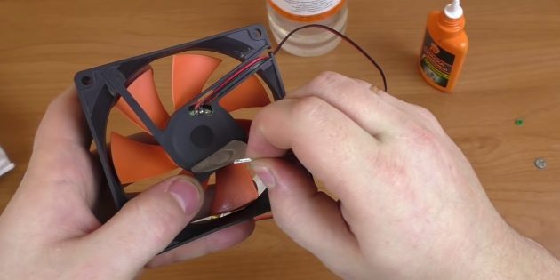 Теперь, когда есть доступ к валу и втулке (подшипнику), можно смазать трущиеся поверхности. С помощью шприца или иным способом нанесите на детали по одной‑две капли средства. Покрутите крыльчатку, чтобы смазка разошлась по поверхностям, и добавьте ещё буквально одну каплю.