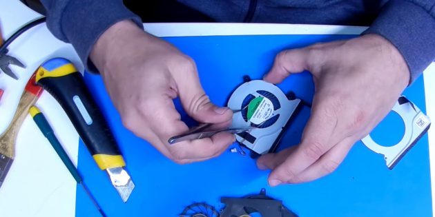 Часто миниатюрные кулеры делают неразборными. Вместо винтов используются пластиковые заклёпки, а крыльчатка не снимается просто так. В таком случае аккуратно срежьте пластиковые детали острым ножом и приподнимите верхнюю крышку, поддев тем же инструментом или тонкой отвёрткой.