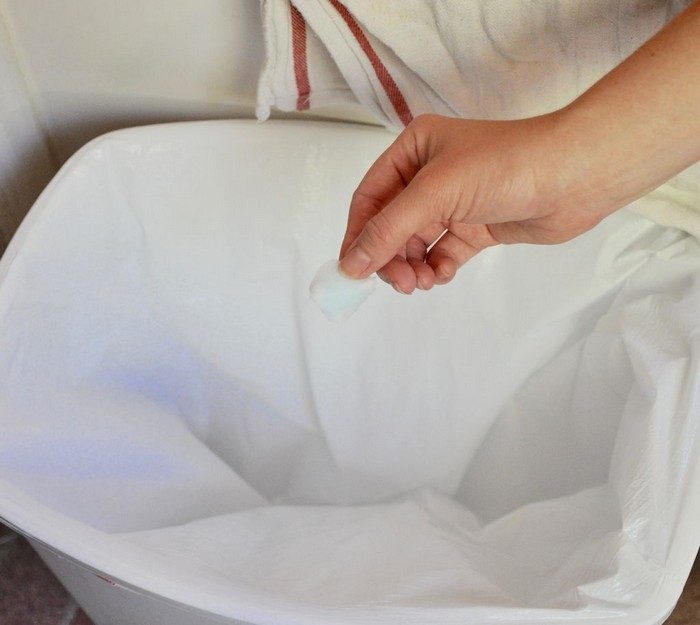 Пропитайте ватный диск ополаскивателем и закиньте в контейнер. А лучше выносите мусор как можно чаще.